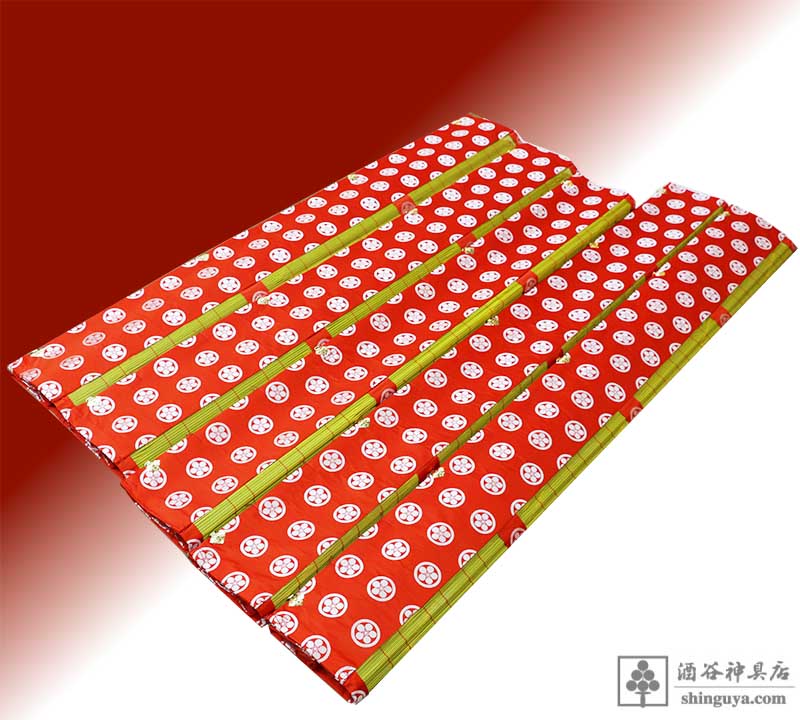 幅162㎝丈73㎝、竹は綿糸一本返し編み、布地は赤地金紋(丸に梅鉢)です。
