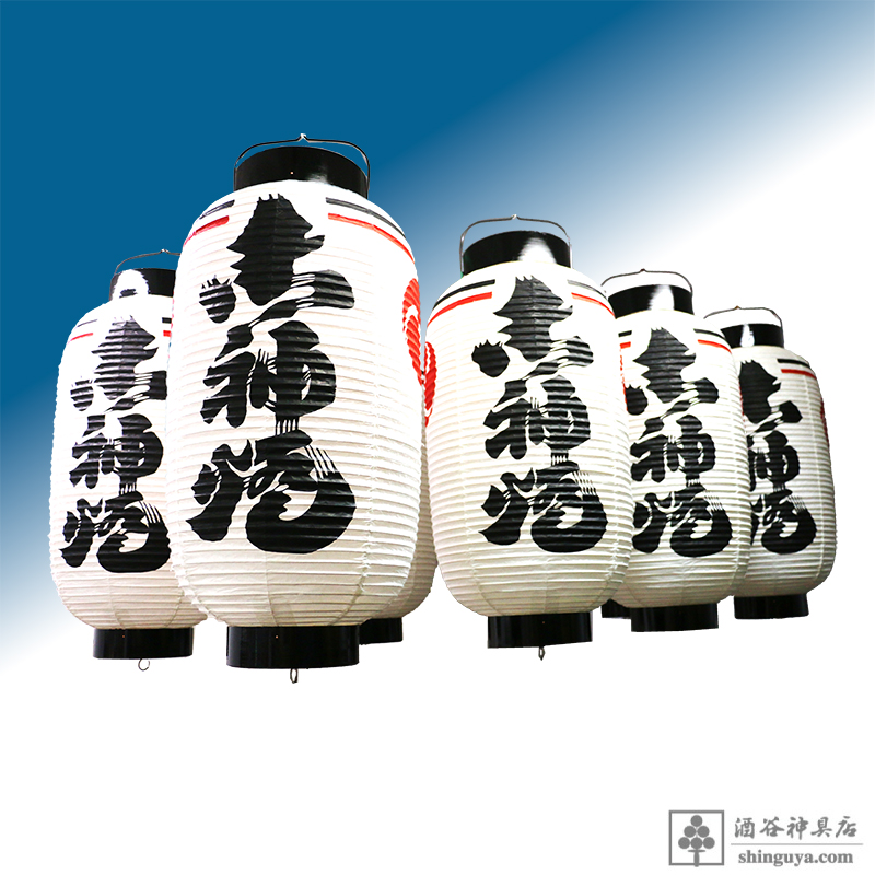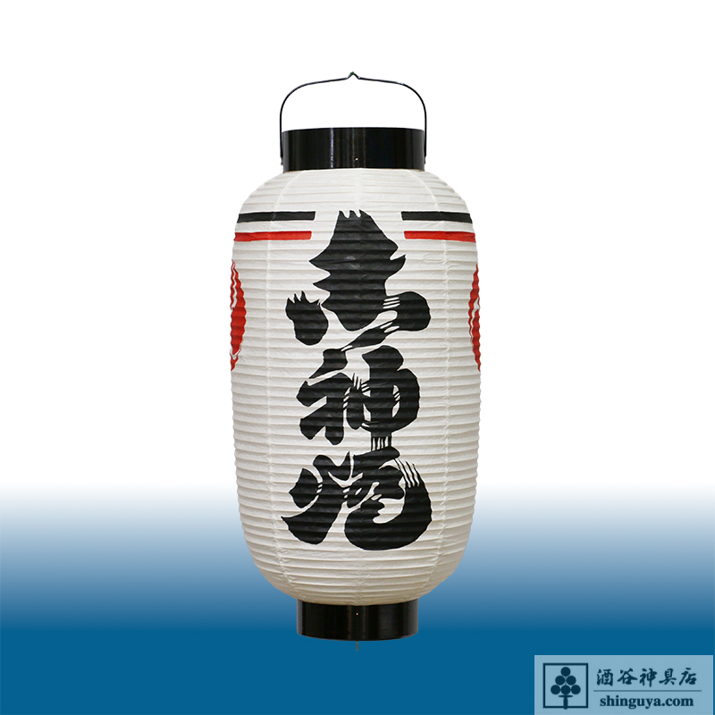 ホーム > 別注品 > 神具 > 高張提灯 1尺3寸 御神燈 崩し文字 左右 左三つ巴 上部 黒赤二本線