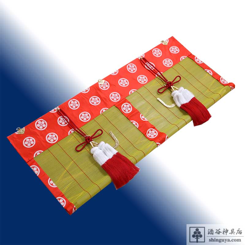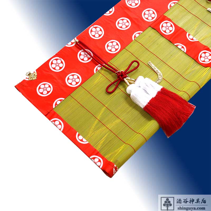 幅90㎝丈60㎝、竹は綿糸表編み、布地は赤地白紋(梅鉢紋入り)、