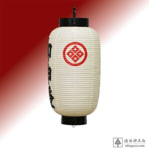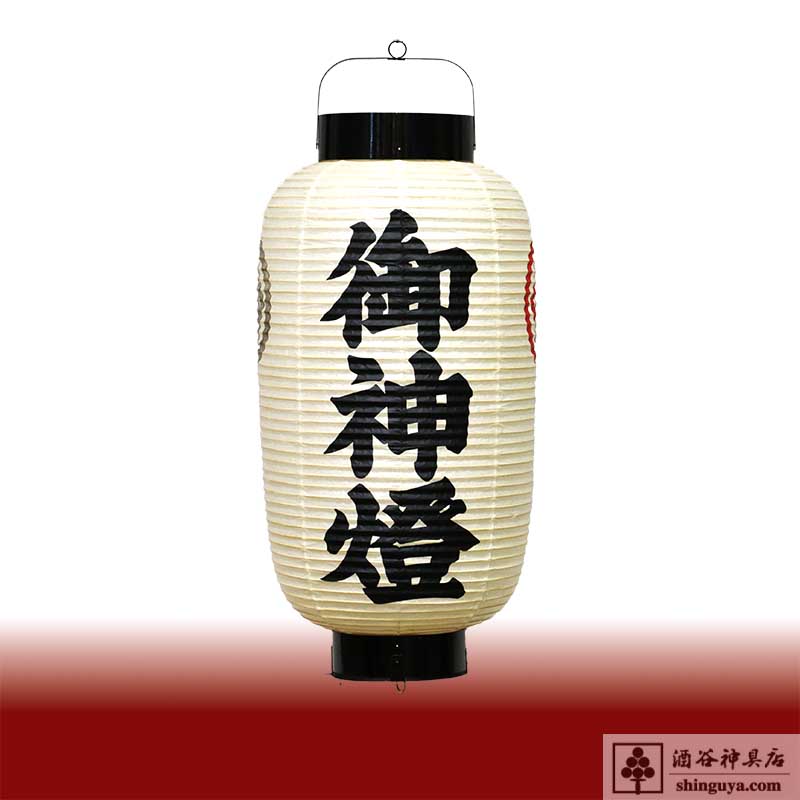 高張提灯 1尺3寸 「御神燈」 家紋:丸に隅立て四つ目 赤色 薄墨(黒縁) 紋入り